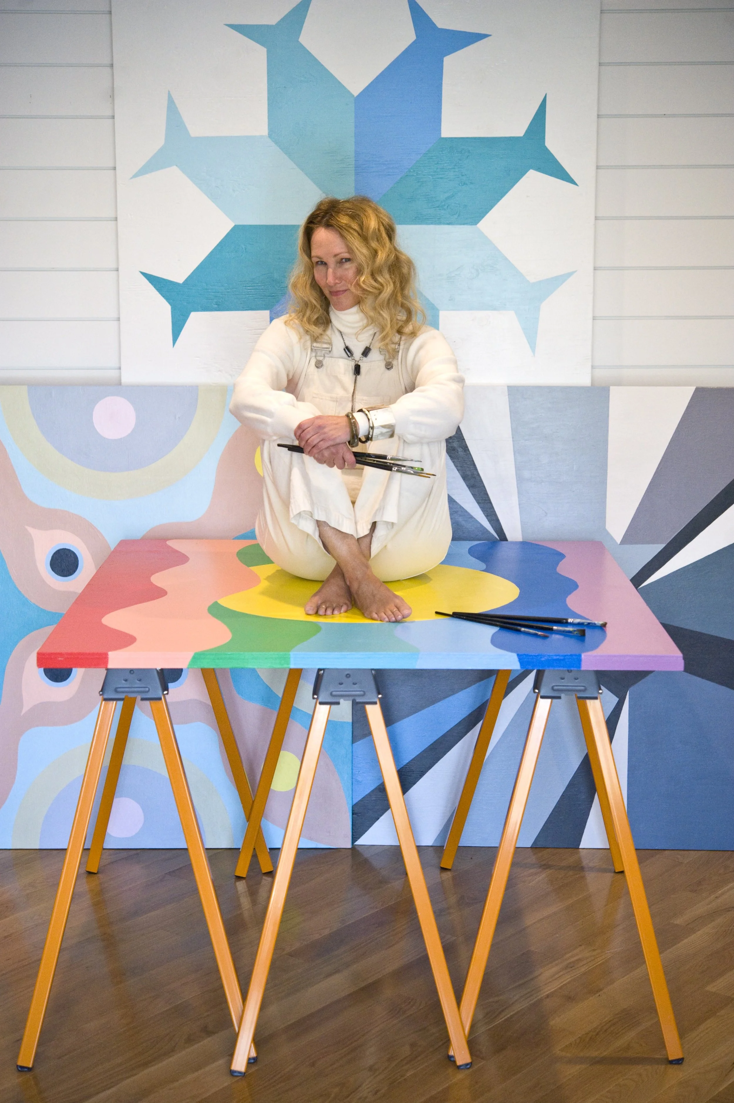 Interior Designer and Artist, Jennifer Pond paints in the Folk Art tradition of Barn Quilts. Depicting bold geometrics meant to be viewed from a distance, her works are enhanced with a modern Pop aesthetic. Highly customizable acrylic painted on board with a stabilizing back frame, these works can weather the elements outside or live inside.